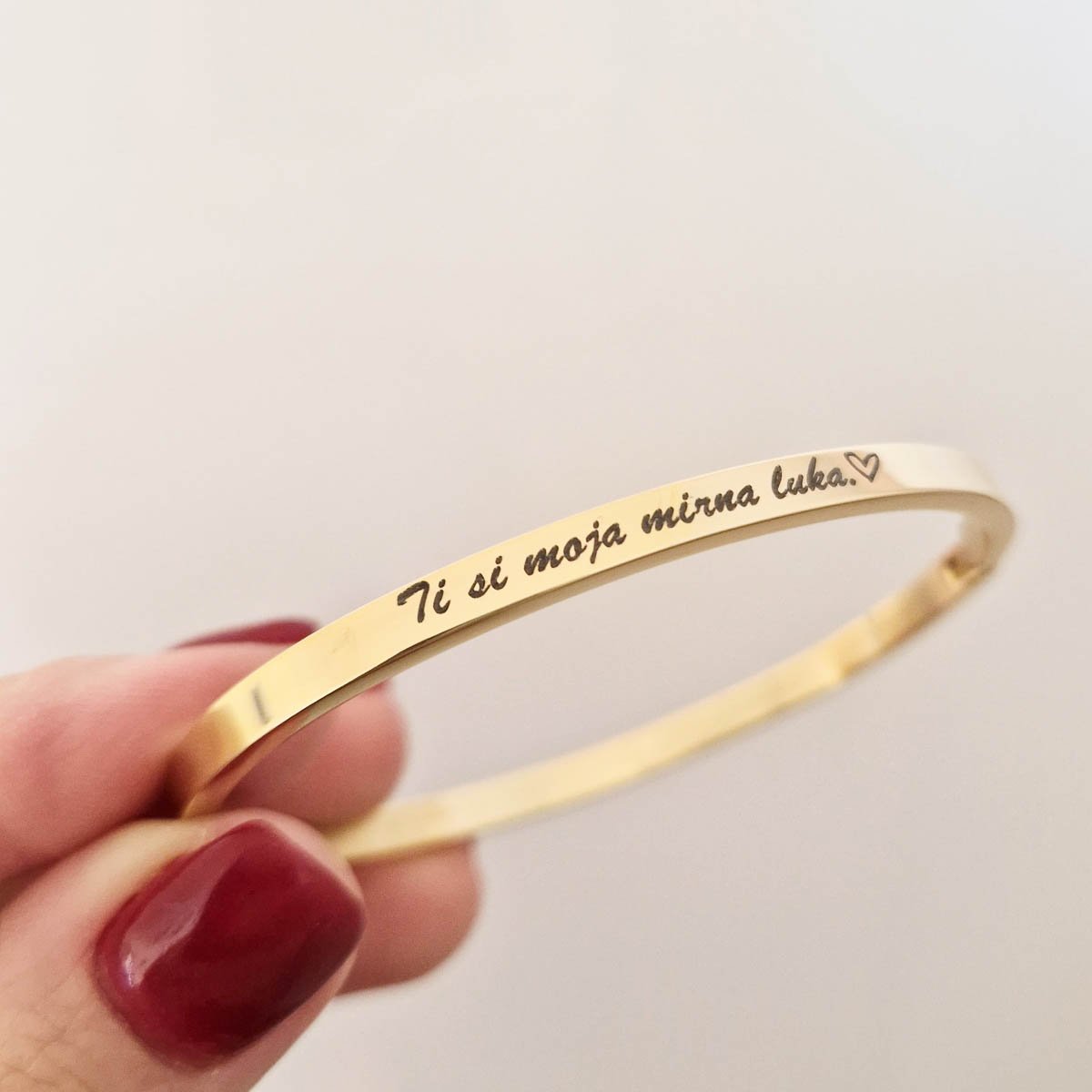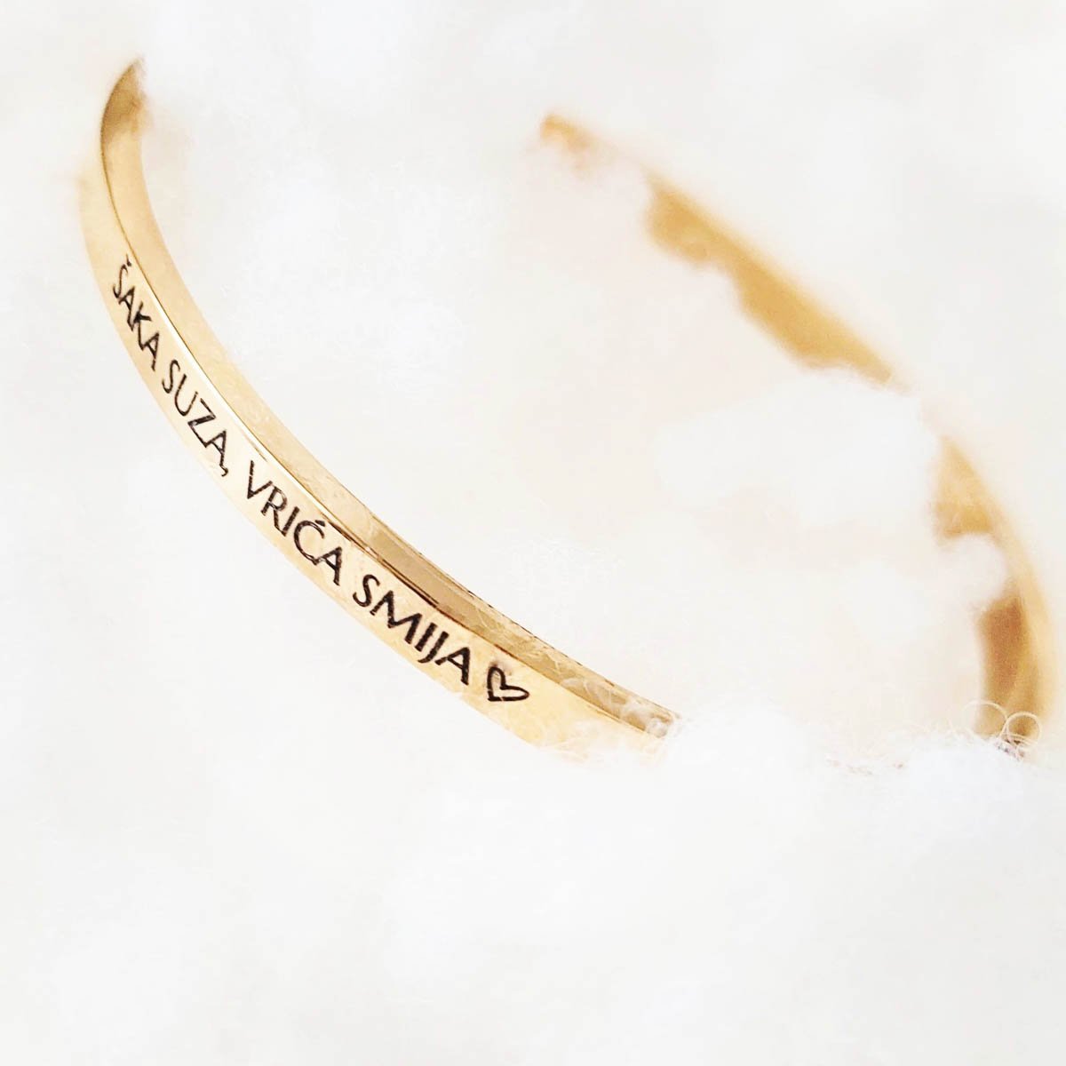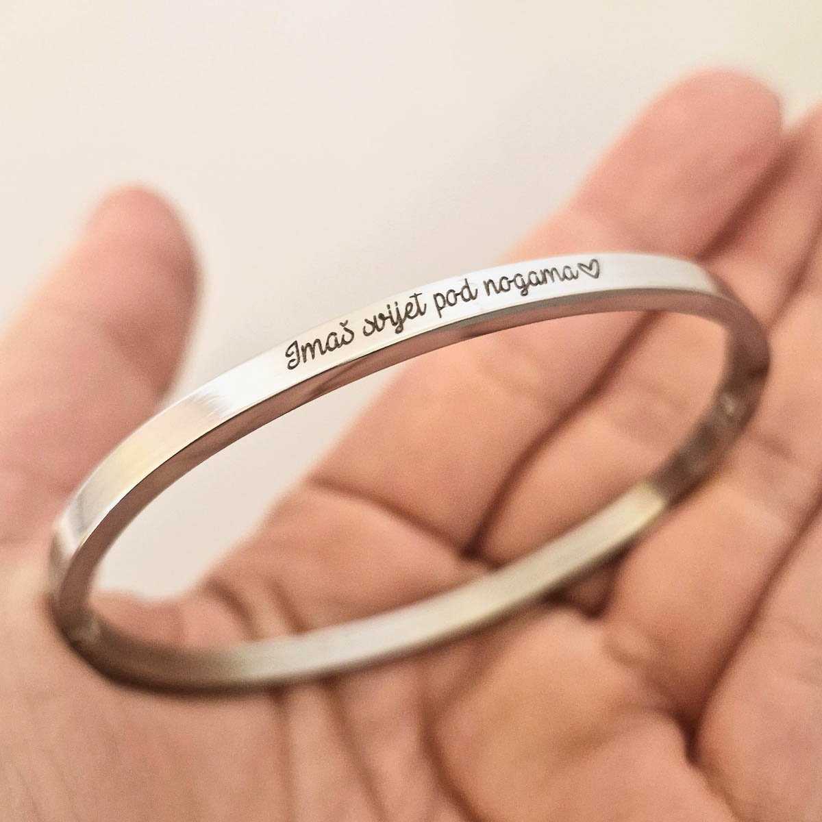 Narukvica s gravurom po želji predstavlja savršen spoj elegancije i osobnosti. Ovaj jedinstveni komad nakita može se prilagoditi kako bi odražavao posebne trenutke, imena ili poruke koje su vam važne. Dodavanjem elemenata po želji Vaš nakit postaje priča koja nosi vaše uspomene i osjećaje, stvarajući tako neponovljiv stil.