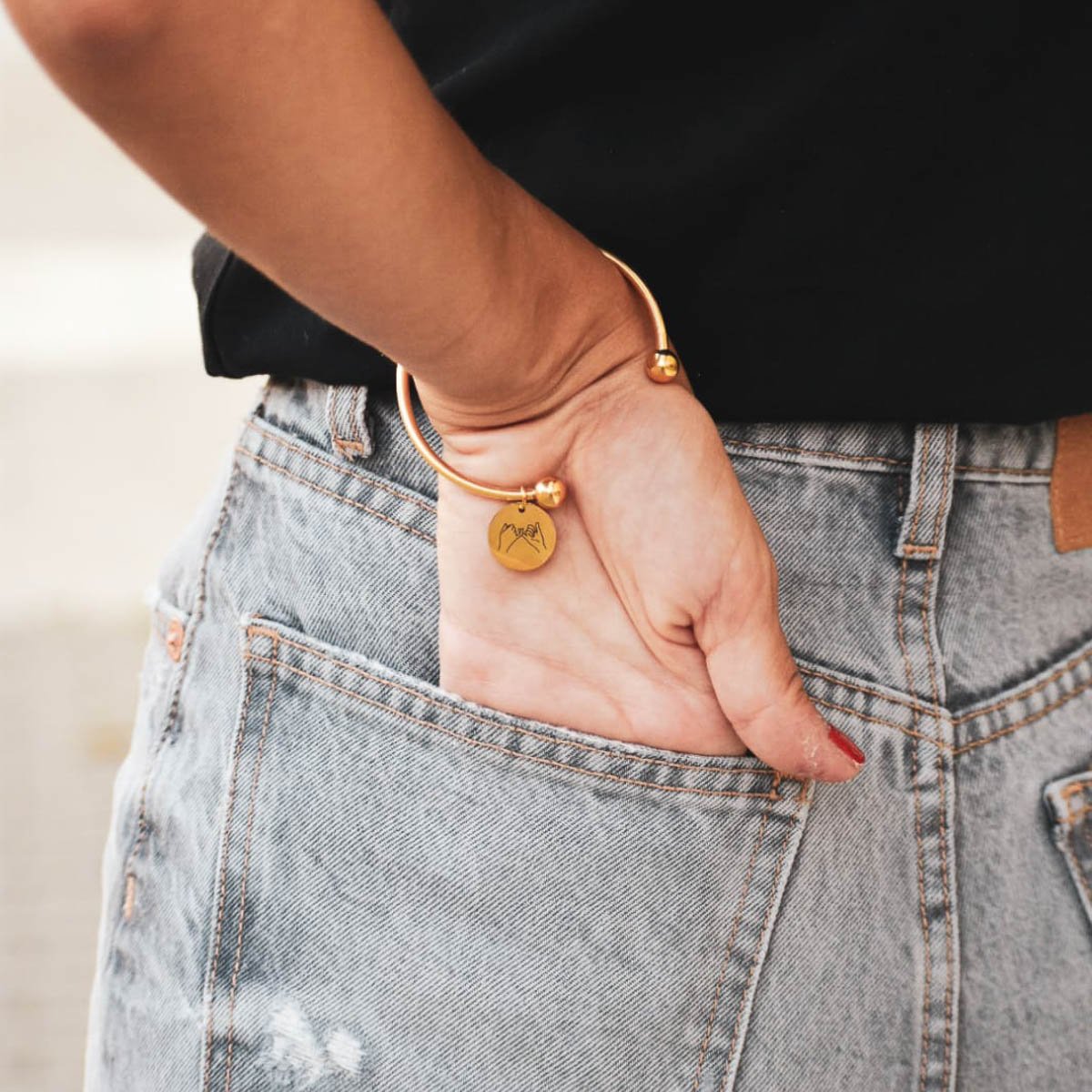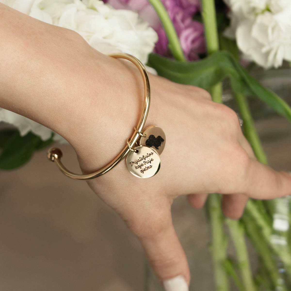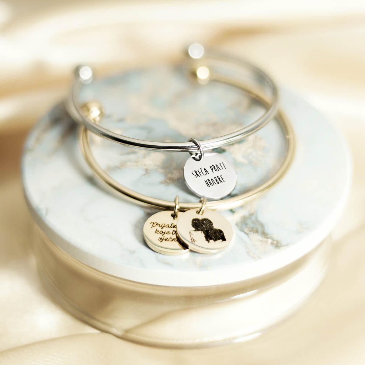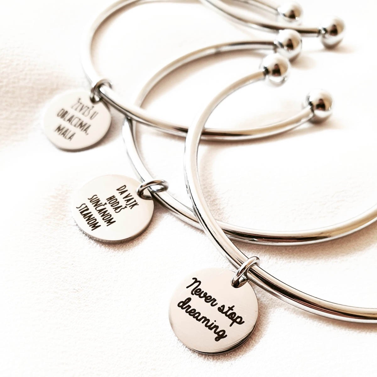 Narukvica s gravurom po želji predstavlja savršen spoj elegancije i osobnosti. Ovaj jedinstveni komad nakita može se prilagoditi kako bi odražavao posebne trenutke, imena ili poruke koje su vam važne. Dodavanjem elemenata po želji Vaš nakit postaje priča koja nosi vaše uspomene i osjećaje, stvarajući tako neponovljiv stil.