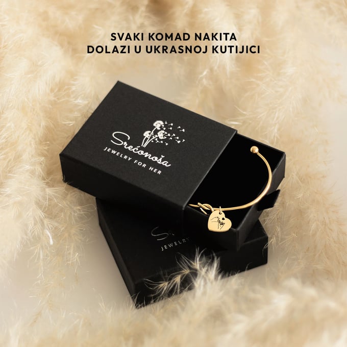 Svaki komad našeg nakita dolazi pažljivo zapakiran u elegantnu ukrasnu kutiju, savršeno za darivanje ili čuvanje vaših dragocjenosti.
