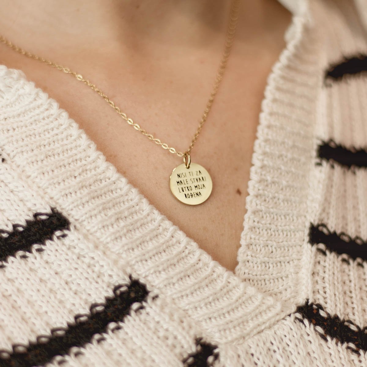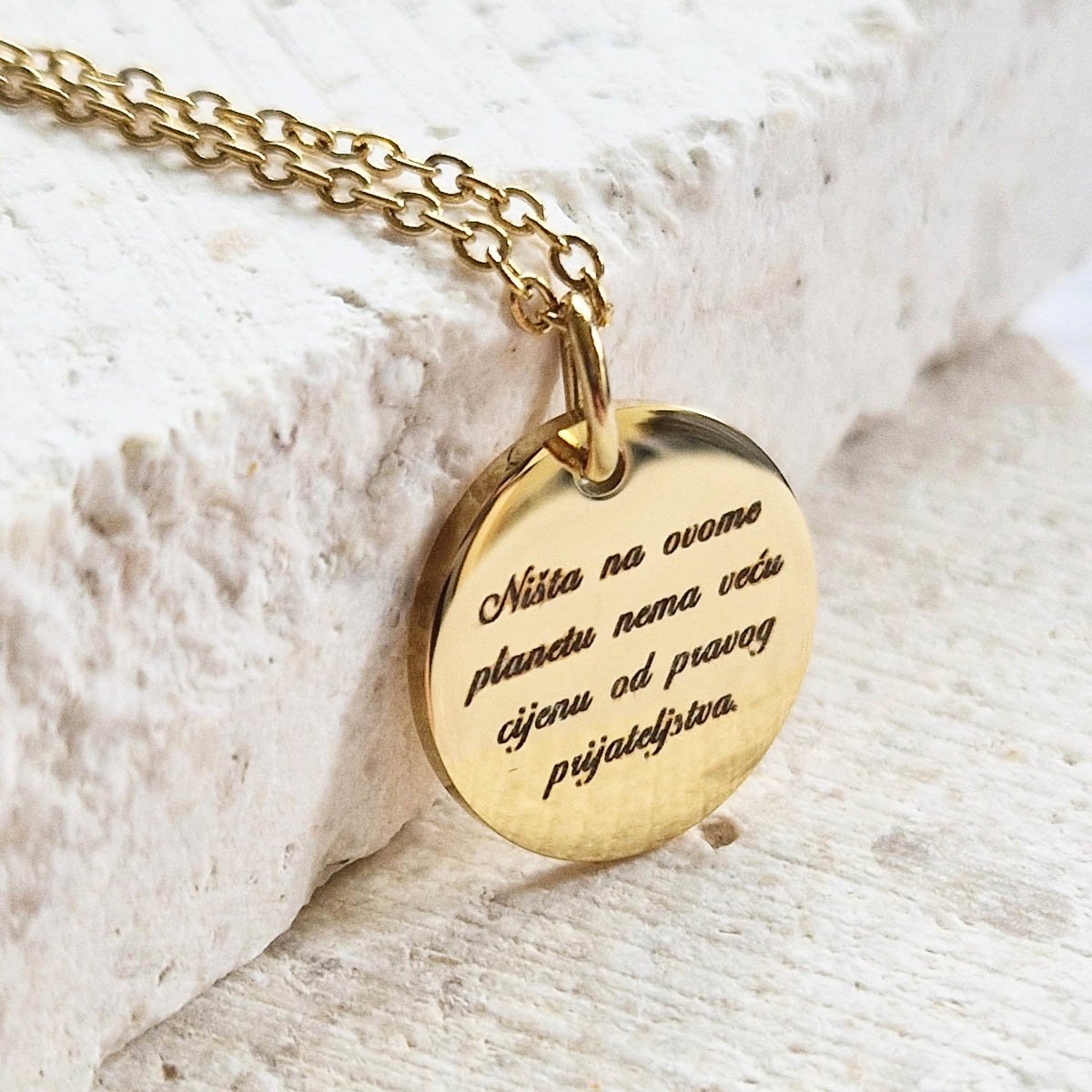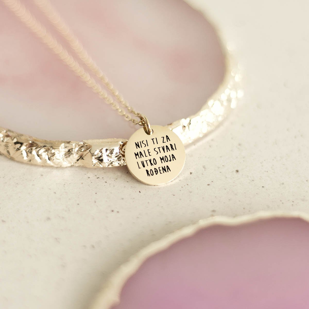 Ogrlica s gravurom po želji predstavlja savršen spoj elegancije i osobnosti. Ovaj jedinstveni komad nakita može se prilagoditi kako bi odražavao posebne trenutke, imena ili poruke koje su vam važne. Dodavanjem elemenata po želji svaka ogrlica postaje priča koja nosi vaše uspomene i osjećaje, stvarajući tako neponovljiv stil.